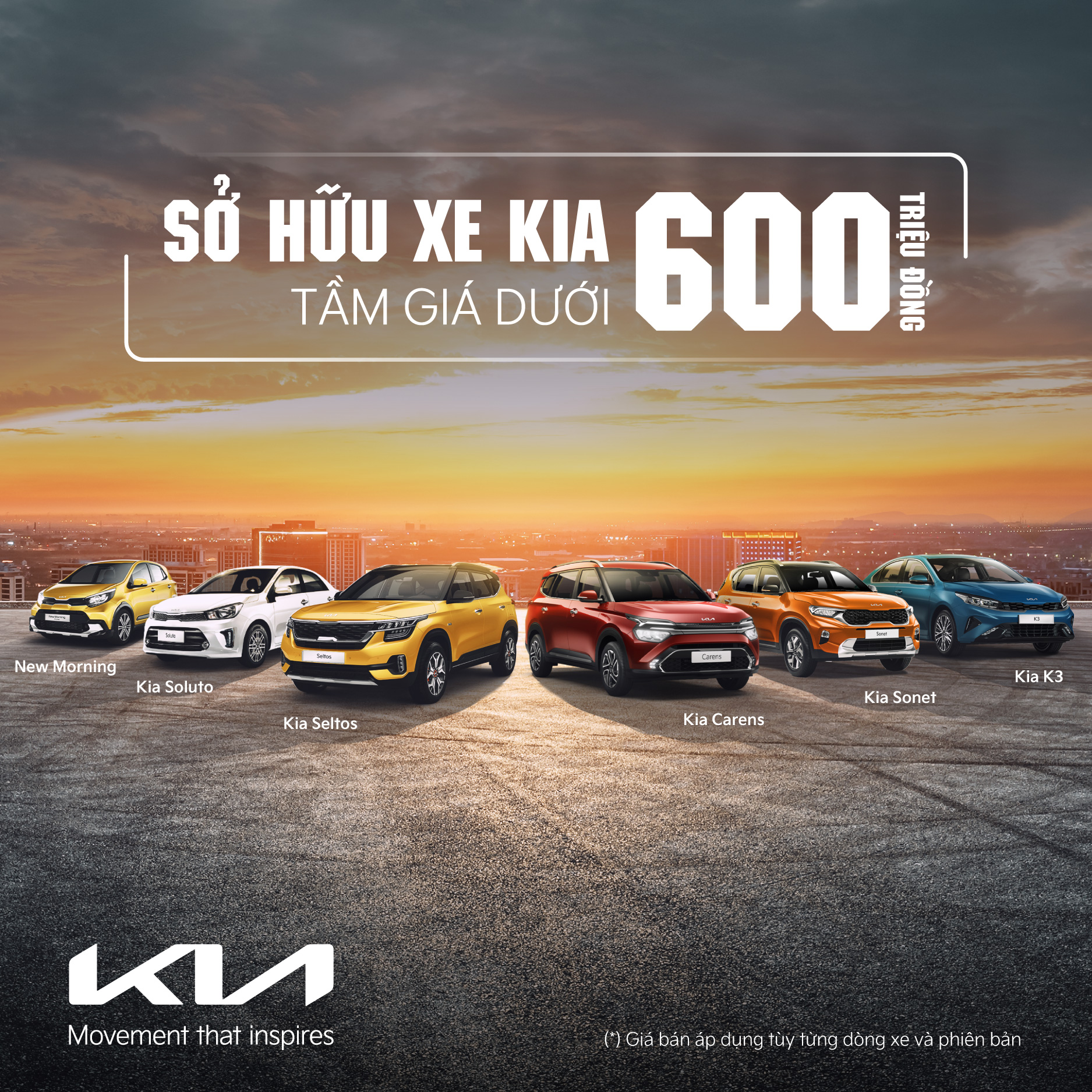 Từ 11/9/2023, Kia áp dụng giá mới với mức điều chỉnh lên đến 75 triệu đồng cho các dòng xe tương đương 50% lệ phí trước bạ. Theo đó, cùng với chính sách giảm 50% trước bạ từ chính phủ và chương trình ưu đãi mới của Kia Việt Nam, khách hàng có cơ hội tốt nhất trong năm để sở hữu các dòng xe Kia thế hệ mới với ưu đãi tương đương 100% lệ phí trước bạ.
