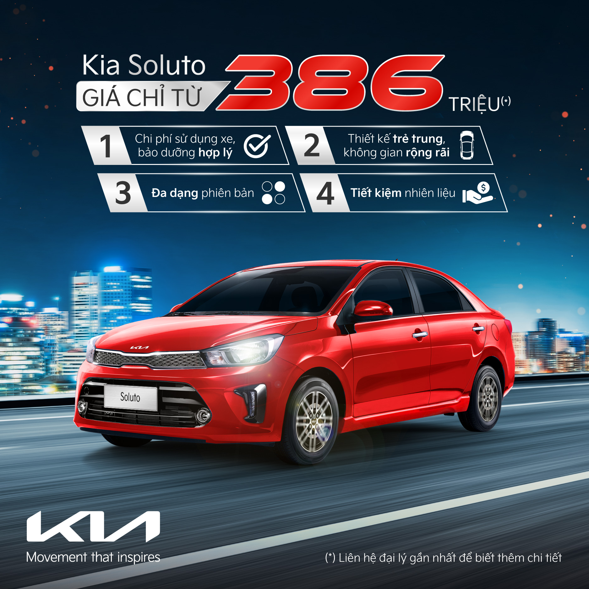 Để đáp ứng nhu cầu di chuyển vào dịp cuối năm và thị hiếu ngày càng tăng của khách hàng, đồng thời tăng sức cạnh tranh cho mẫu xe Kia Soluto trong phân khúc B-sedan, Kia Việt Nam áp dụng giá bán mới cho 1 số phiên bản của mẫu xe Kia Soluto.